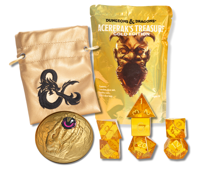 Unlock the mysteries of the Dungeons & Dragons Acererak's Treasure Packs: Gold Edition, where every pack is a gateway to a D&D adventure. Each pack contains a full 7-piece dice set, a metal ability coin, and a quality embroidered D&D bag. Be on the hunt for only 50 SUPER LEGENDARY Gold Packs!