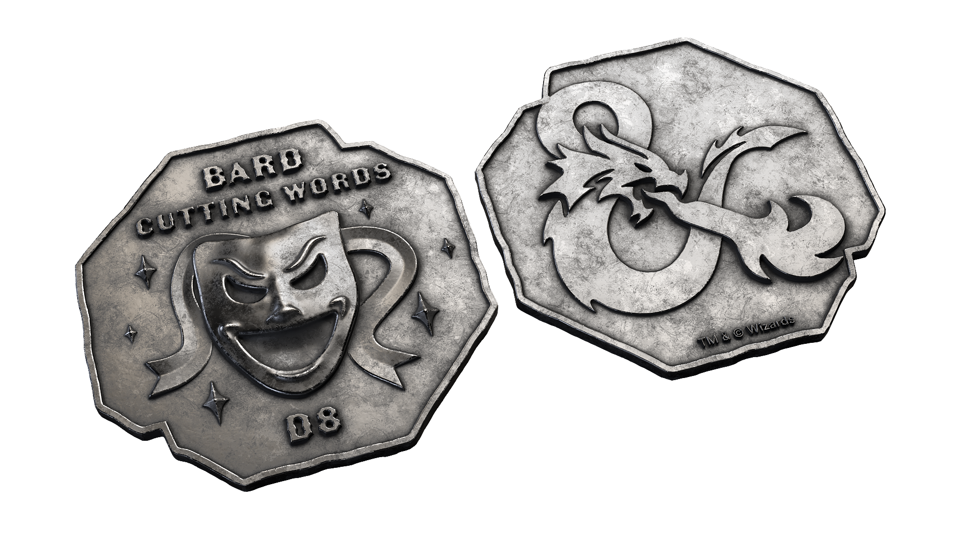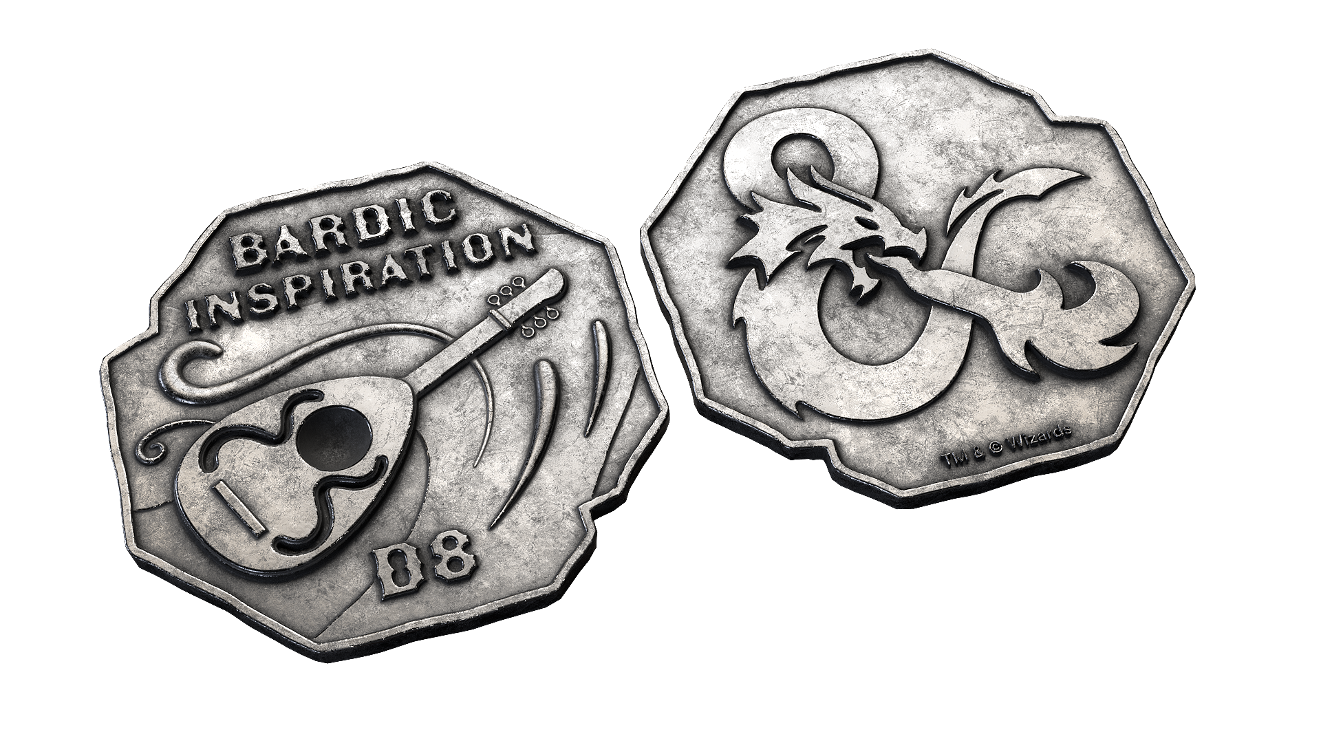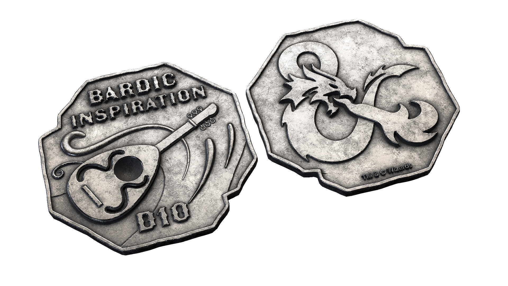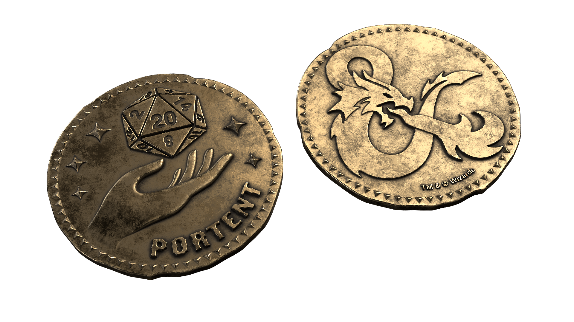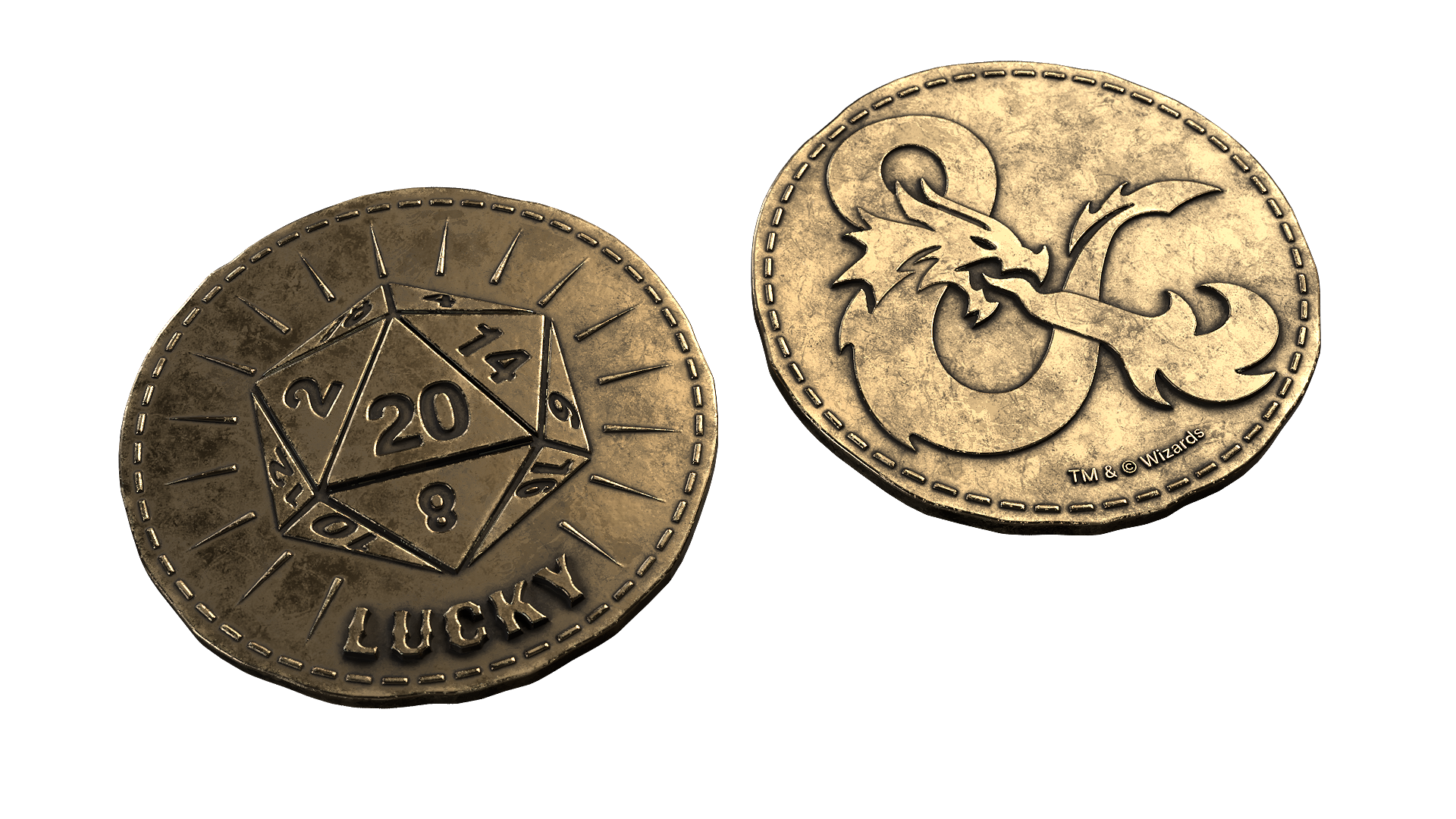 1x ABILITY COIN Contains one of our 22 original 40mm metal dice coins featuring a unique design on each face and the Dungeons & Dragons logo on the back.