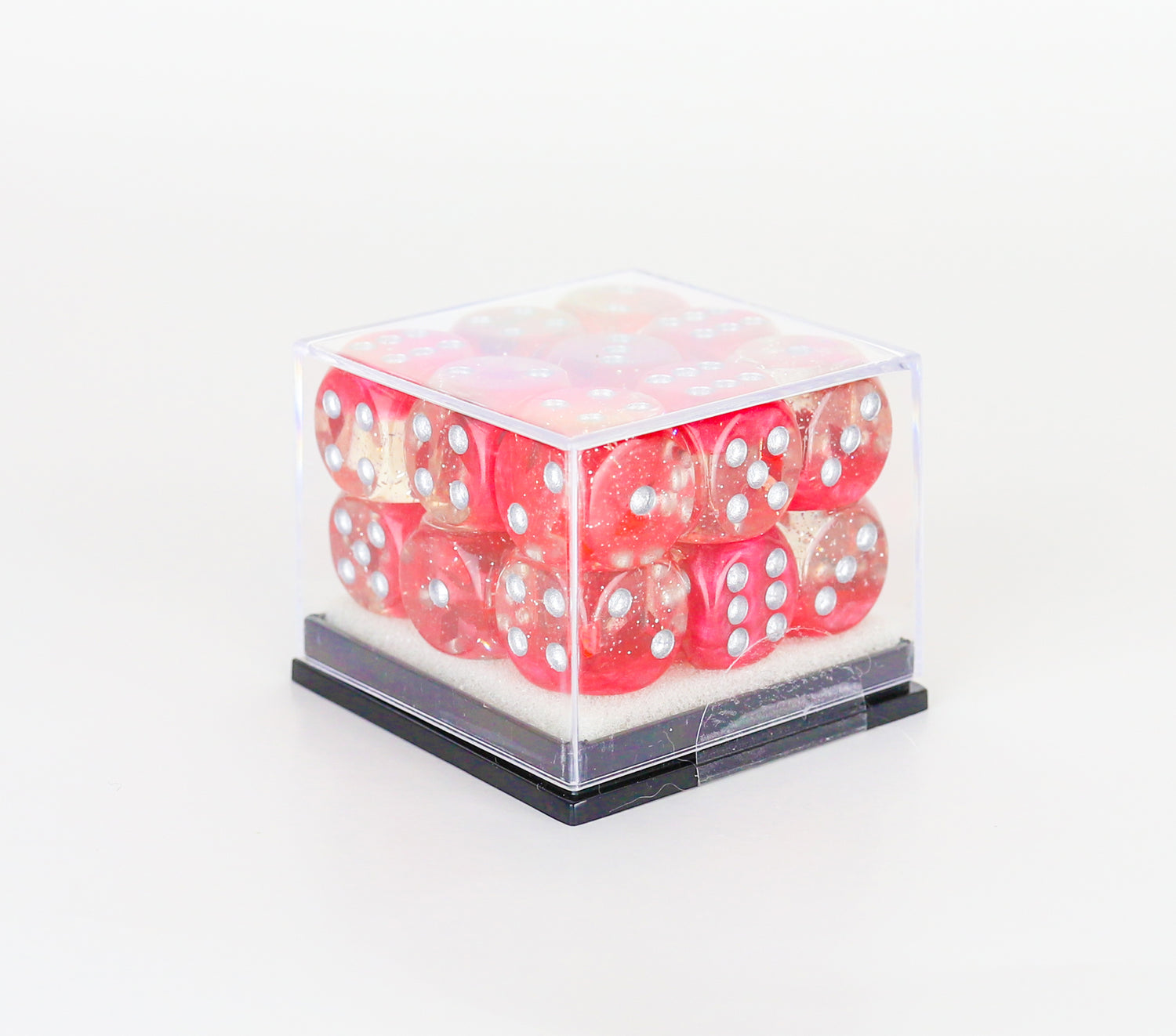 Gaming dice set: Diamonds float in layers of glistening clear and red resin. Eighteen (18) D6 dice in a square cube. Dice are red and sparkling clear resin.