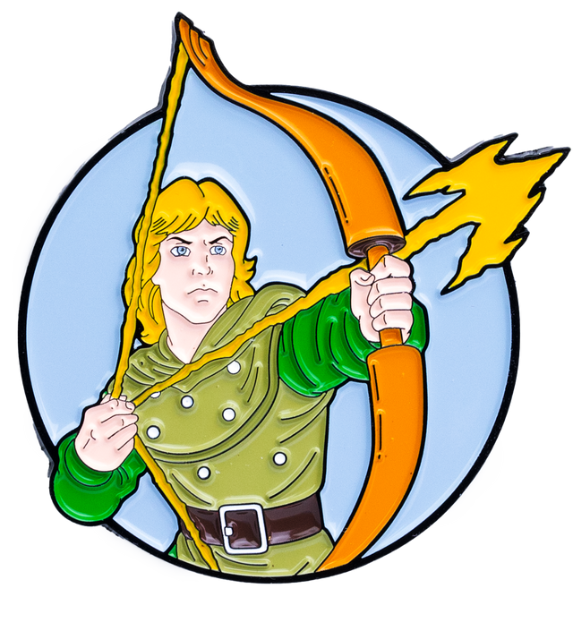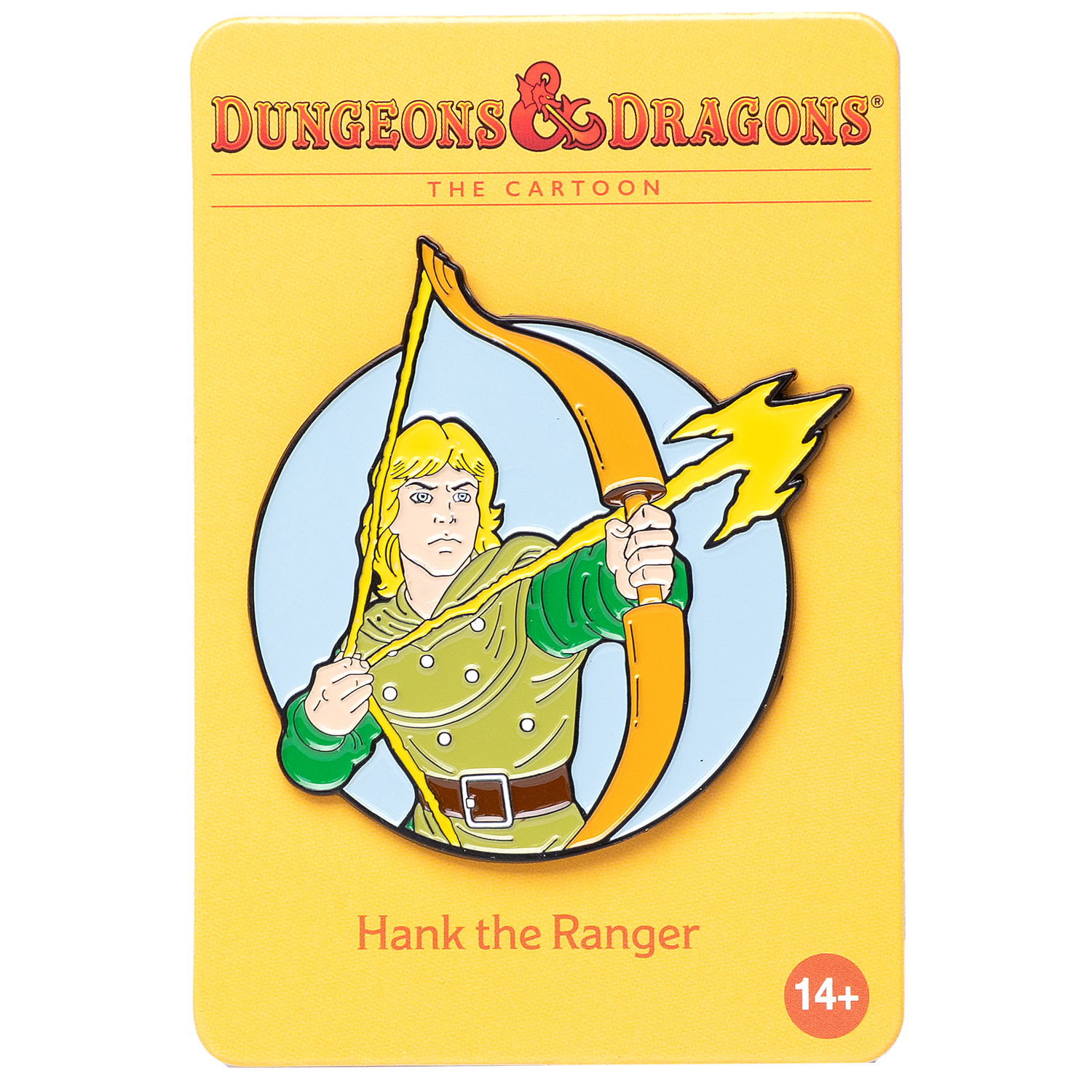 This collectible pin features Hank the Ranger from the classic Dungeons & Dragons cartoon, showcasing his courageous and determined spirit. Designed with vibrant enamel, it highlights his iconic blonde hair, green tunic, and magical energy bow drawn and ready for action. A perfect addition for fans of the series, this pin celebrates the fearless leader of the group in style.