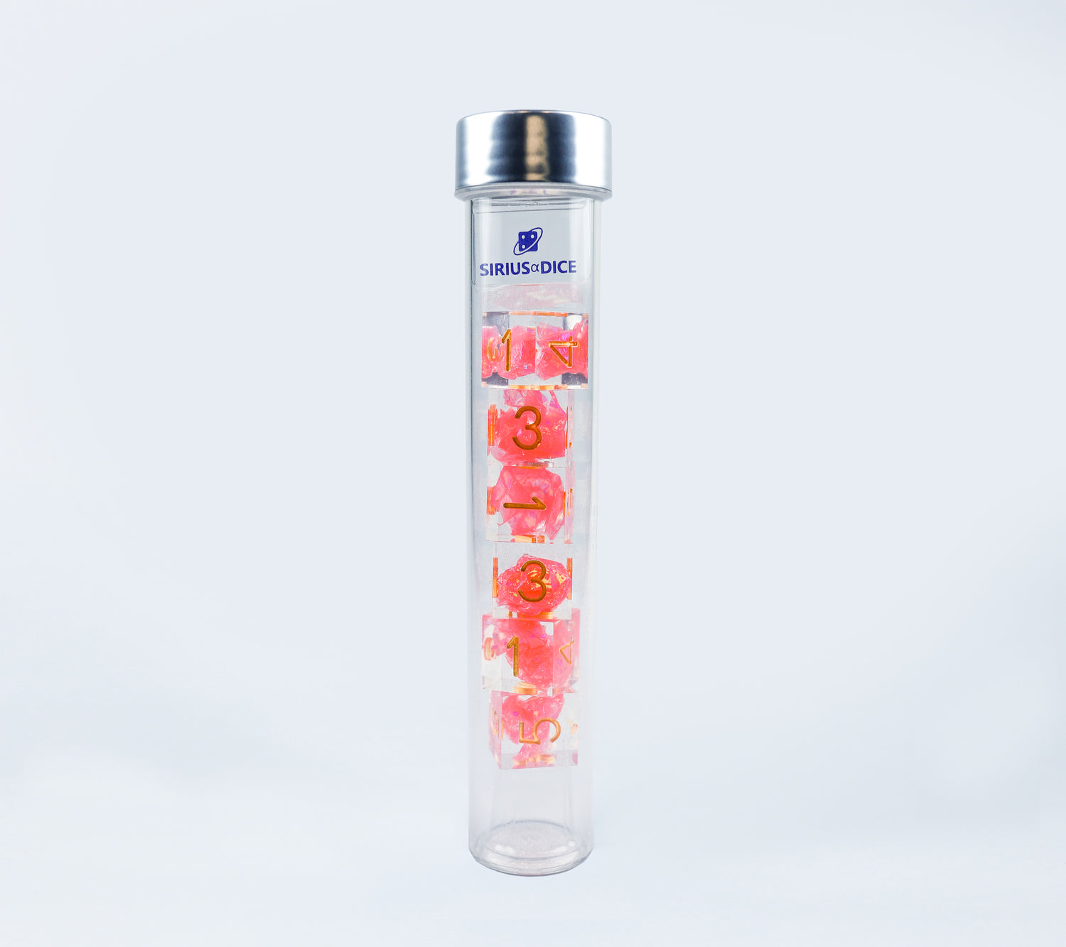 Stick your rolls with these beautiful sharp-edged D6 dice. Six (6) D6 Sharp Flamingo dice in a flat-bottomed tube. Dice are clear and feature a pink and a gold swirling ball at their core.