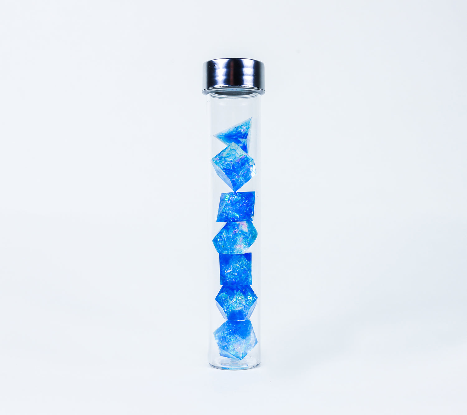 Add excitement and intrigue to your game with this ultra premium sharp-edged polyhedral dice set. Roll the die and reveal the result by using the accompanying UV light pen. These nice dice are hand polished sharp-edged translucent dice with an opalescent shimmer inside.