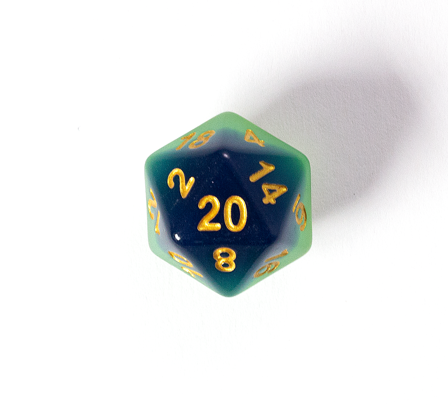 Set of 7 polyhedral dice plus 1 extra D20. Packaged in a flat-bottom tube, so you can easily carry and store your dice. Style: Green + Blue Translucent. Green dice set.