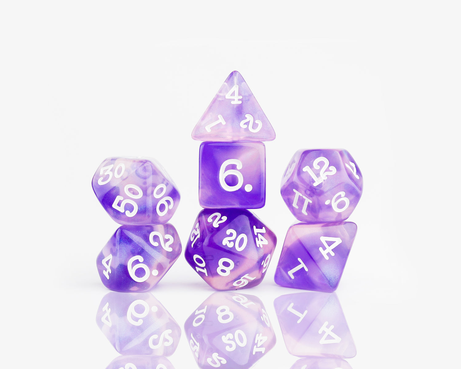 Our glazed dice series features clouds of color swirled with color and a bit of sparkle. The Purple Glaze set features a set of 7 polyhedral dice in purple and white plus 1 extra D20. Packaged in a flat-bottom tube, so you can easily carry and store your dice.