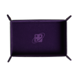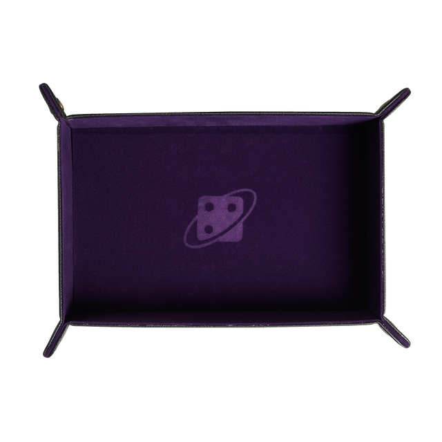 Rectangular dice tray lays flat for transport. Then snap it together to use as a dice tray. Black leather outside and purple felt inside. Can be reversed. Add size.