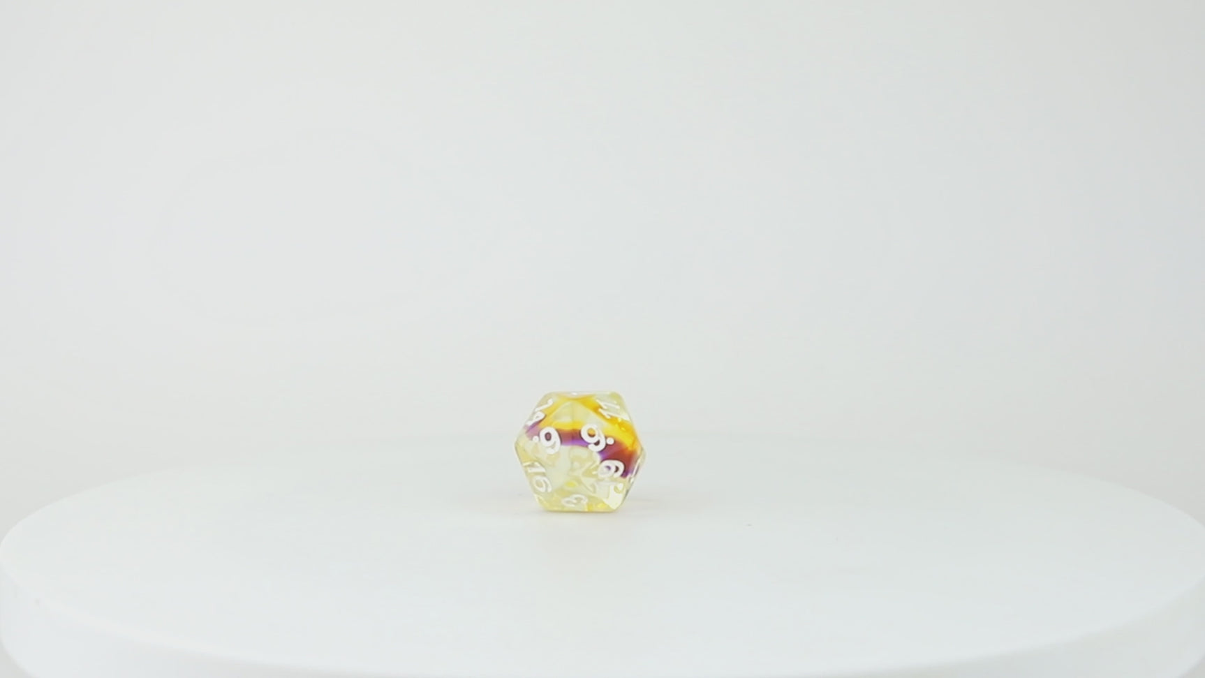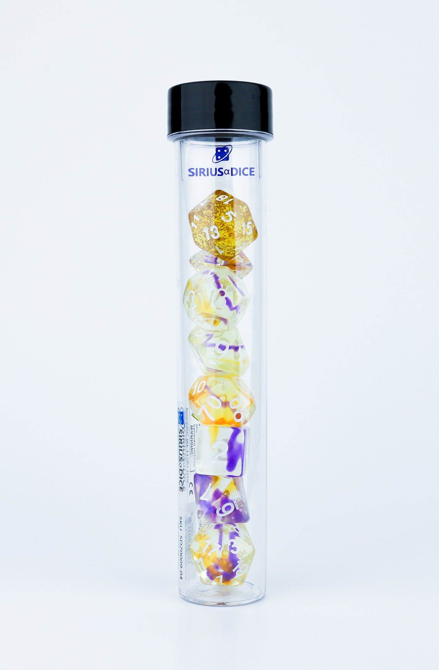 Bands of lustrious violet intertwine with golden yellow in crystal resin. This set of 7 polyhedral dice includes an extra glistening sunburst D20. Packaged in a flat-bottom tube, so you can easily carry and store your dice.